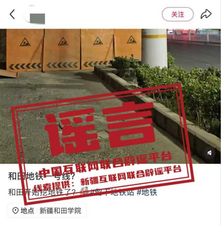 真相:近日,有網(wǎng)民發(fā)布消息稱“新疆和田要建地鐵一號(hào)線?開始挖地鐵了?”,并配以道路施工圖片,引發(fā)關(guān)注。經(jīng)和田市交通運(yùn)輸局核實(shí),網(wǎng)傳信息系謠言,截至目前,未收到任何關(guān)于和田市開挖地鐵的工作通知或確認(rèn)信息。(來源:“新疆網(wǎng)絡(luò)辟謠”微信公眾號(hào))