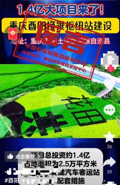 真相:近日,有網(wǎng)民發(fā)布信息稱“1.4億大項目來了,重慶酉陽換乘樞紐站建設(shè),新建汽車客運站及相關(guān)配套”,引發(fā)關(guān)注。經(jīng)重慶市酉陽縣交通運輸委核實,酉陽縣正在推進(jìn)桃花源景區(qū)游客集散中心提升項目,暫無“1.4億建設(shè)換乘樞紐站”項目,網(wǎng)傳信息系謠言。(來源:“重慶辟謠”微信公眾號)