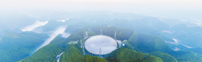 層巒疊嶂,翠林如海。在貴州省平塘縣的大山之間,一座恢弘大氣的單口徑球面射電望遠(yuǎn)鏡靜靜佇立,凝望星空,帶著人類的好奇和期待,探尋百億光年之外的射電信號(hào)。