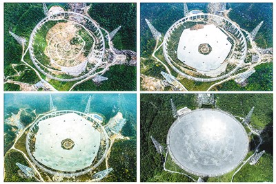 這是一張拼版照片:依次為“中國(guó)天眼”拼裝第一塊反射面板(左上,2015年8月2日攝)、“中國(guó)天眼”反射面板安裝近半(右上,2015年12月16日攝)、“中國(guó)天眼”反射面板安裝近八成(左下,2016年3月9日攝)、維護(hù)保養(yǎng)期間的“中國(guó)天眼”(右下,2022年7月21日攝)。新華社記者 歐東衢攝