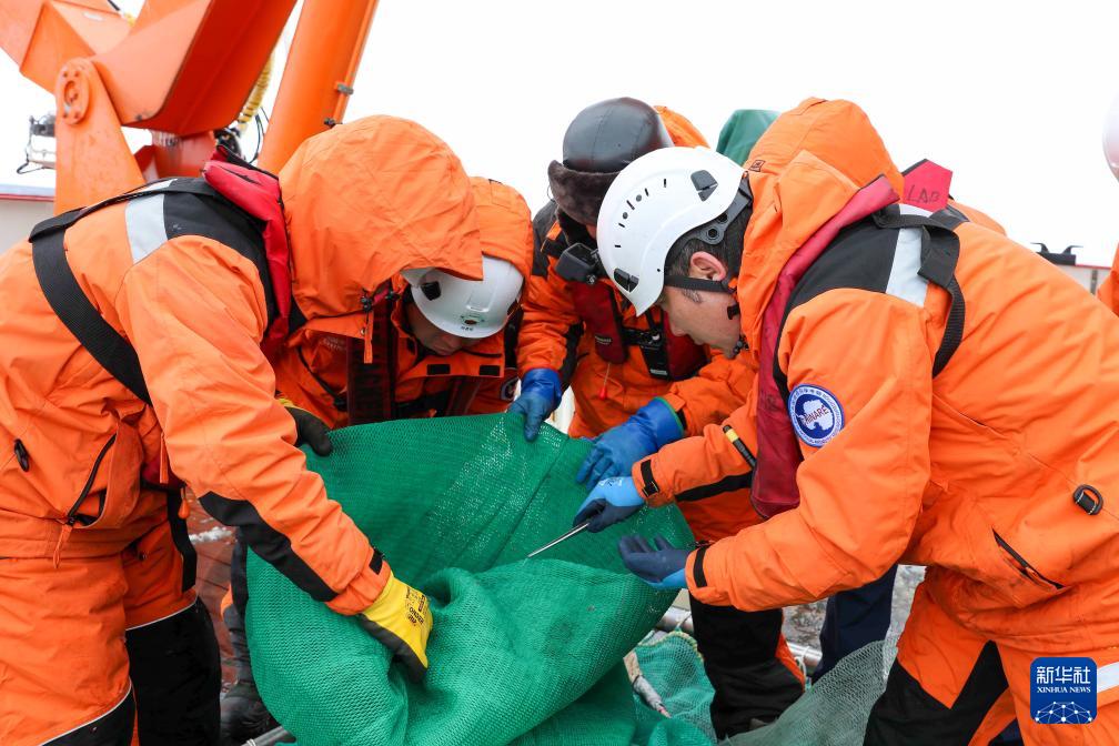 北京時(shí)間2024年1月5日凌晨,在“雪龍2”號(hào)艉甲板,中國(guó)第40次南極考察隊(duì)開始了抵達(dá)阿蒙森海后的首次考察作業(yè)。新華社記者 周圓 攝