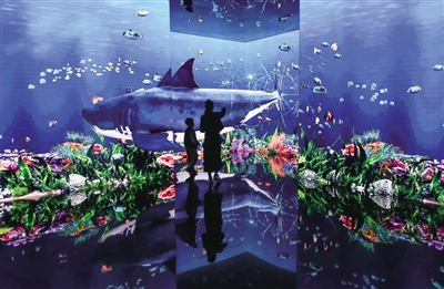圖為游客在位于濟(jì)南市的山東省美術(shù)館參觀體驗(yàn)“無限之海”沉浸式AI數(shù)字藝術(shù)展。新華社發(fā)(郝鑫城 攝)