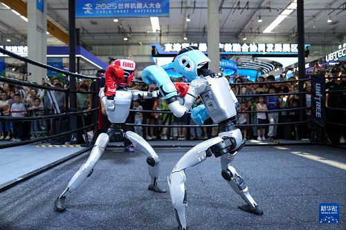 在2025世界機(jī)器人大會展館內(nèi),觀眾在宇樹機(jī)器人展臺觀看機(jī)器人拳擊展示(8月11日攝)。新華社記者 鞠煥宗 攝