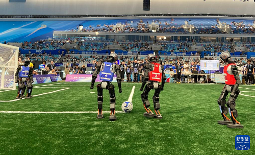 圖為2025世界人形機(jī)器人運(yùn)動(dòng)會(huì)上機(jī)器人在踢足球。新華社記者 魏夢(mèng)佳 攝