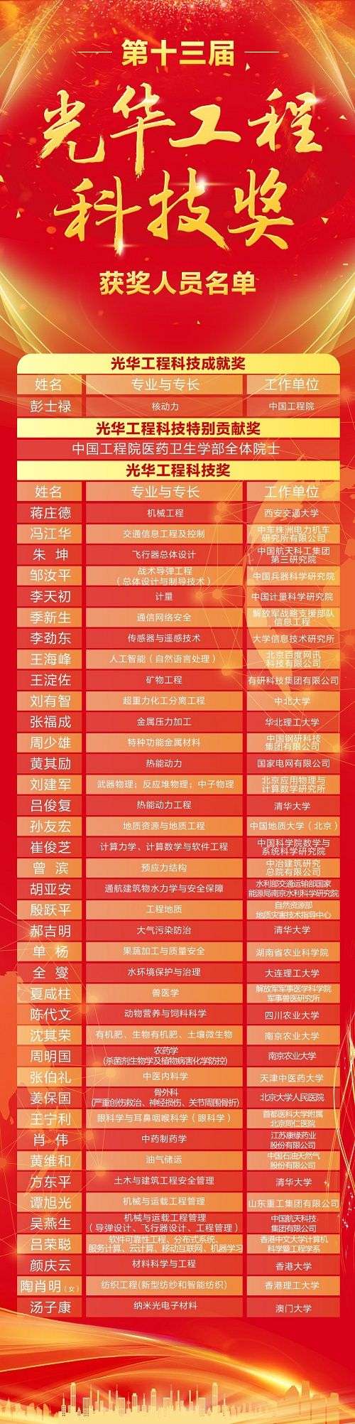 此外,還有機(jī)械工程專家蔣莊德、計量專家李天初、人工智能專家王海峰、特種功能金屬材料專家周少雄等不同學(xué)科領(lǐng)域的39位專家獲得光華工程科技獎,這些專家均以非凡的積極性和創(chuàng)造性,在各自領(lǐng)域取得了傲人成績,為我國工程科學(xué)技術(shù)事業(yè)的發(fā)展做出了巨大貢獻(xiàn)。