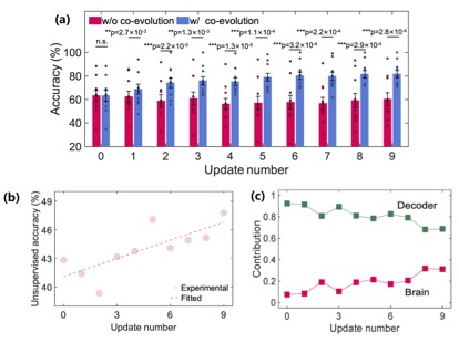 (a)協(xié)同演進腦機解碼正確率較初始狀態(tài)提高20%;(b)任務相關腦電特征發(fā)生正向演化;(c)腦與憶阻器解碼器實現互適應。(聯合研究團隊供圖)