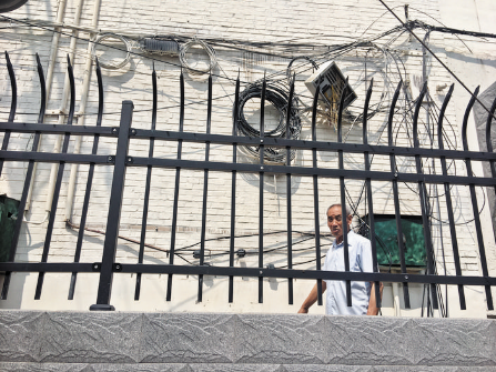 記者在位于該路口的市化工局宿舍樓側(cè)面墻上看到布滿“蛛網(wǎng)”般的電線,藕斷絲連,錯綜復(fù)雜。小區(qū)住戶劉大爺告訴記者,這堵墻上的電線種類繁多復(fù)雜,最要緊的是其中的高壓電線固定在距離地面只有1米至1.5米左右的墻上,電線外面的PVC保護(hù)管已經(jīng)因年久失修嚴(yán)重老化,電線直接裸露在外,遇上下雨打雷天氣非常危險(xiǎn),平時(shí)小孩玩耍路過也不安全。據(jù)記者觀察,在距離這堵墻約兩米的地方有1根電線桿,宿舍樓墻上離地面最近的4根黑色電線就是從這根電桿上接進(jìn)來的,電線橫搭部分基本暴露在外,特別不安全。小區(qū)居民希望相關(guān)部門能夠盡快消除隱患,給居民們一個安全放心的居住環(huán)境。