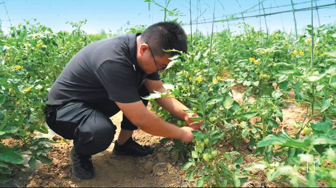 李成功在村集體大棚給西紅柿拔草、打掐、頂尖