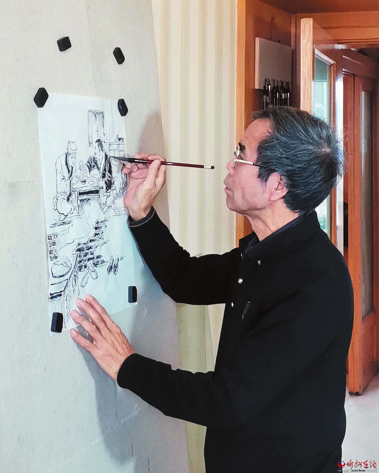 “夢圓畫室”的主理人叫艾吉虎,正如他的視頻號(hào)名字一樣,繪畫是他人生的最大愛好和情感寄托。早些年,艾吉虎曾利用繪畫專長從事過玻璃雕畫,隨著玻璃雕畫在裝修行業(yè)的沒落,艾吉虎轉(zhuǎn)戰(zhàn)其他行業(yè),但兜兜轉(zhuǎn)轉(zhuǎn)離不開他的繪畫愛好。在原平市民俗文化研究會(huì)當(dāng)美編期間,艾吉虎開始嘗試“小人書”的繪畫創(chuàng)作,沒承想,幾個(gè)插圖畫出來,得到許多人的熱烈追捧,這激發(fā)了他繼續(xù)創(chuàng)作的熱情。