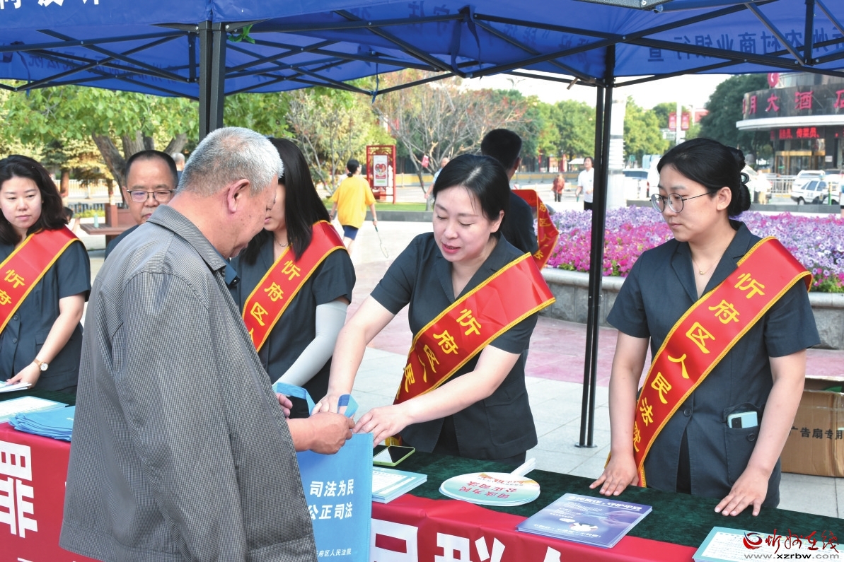 劉佳(右二)正在向過(guò)往群眾發(fā)放宣傳手冊(cè)