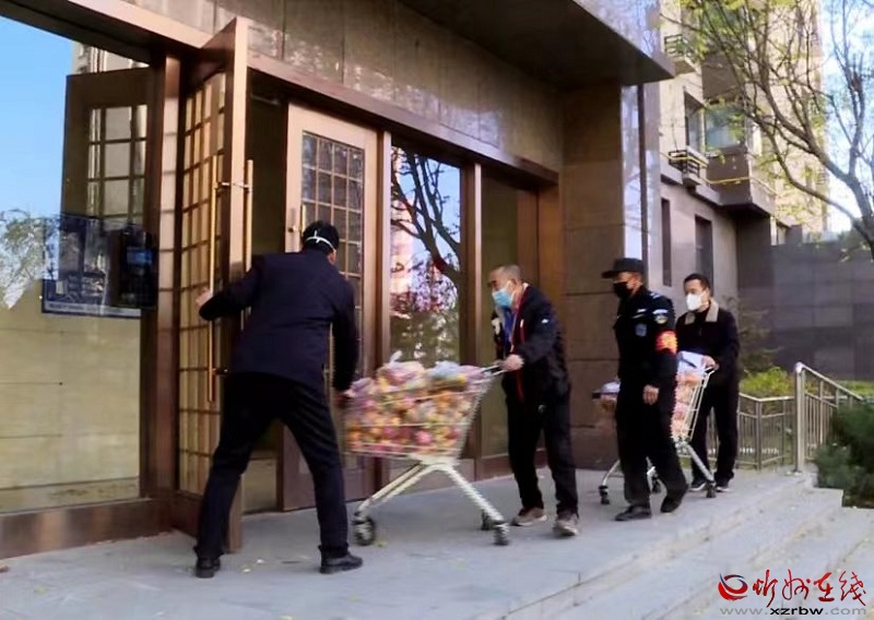 大批裝袋整齊的水果包放在濱河一號(hào)小區(qū)樓下,多名物業(yè)工作人員推著便民購(gòu)物車來回忙碌著,大家統(tǒng)一佩戴口罩,嚴(yán)格做好防護(hù)措施,挨家挨戶送貨上門,并全程避免與業(yè)主接觸,最大限度地保護(hù)廣大群眾的健康與安全。