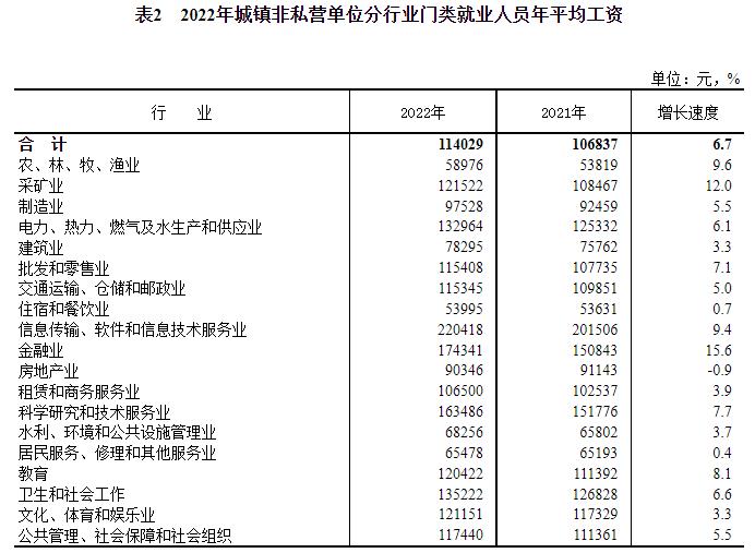 2022年城鎮(zhèn)非私營(yíng)單位分行業(yè)門(mén)類(lèi)就業(yè)人員年平均工資。來(lái)自國(guó)家統(tǒng)計(jì)局網(wǎng)站 國(guó)家統(tǒng)計(jì)局?jǐn)?shù)據(jù)顯示,城鎮(zhèn)非私營(yíng)單位中,IT業(yè)年平均工資達(dá)到220418元。城鎮(zhèn)私營(yíng)單位中,IT業(yè)年平均工資達(dá)到123894元。 在一些省份,IT業(yè)平均工資同樣高居榜首。以浙江為例,浙江省非私營(yíng)單位中,信息傳輸、軟件和信息技術(shù)服務(wù)業(yè)年平均工資突破28萬(wàn)元,達(dá)到了287088元,遠(yuǎn)超其他行業(yè)。 再比如重慶,城鎮(zhèn)非私營(yíng)單位19個(gè)行業(yè)門(mén)類(lèi)中,信息傳輸、軟件和信息技術(shù)服務(wù)業(yè)平均工資最高,超過(guò)16萬(wàn)元,達(dá)到166375元,是全市平均水平的1.55倍。 為什么IT業(yè)平均工資傲視群雄?近年來(lái),隨著數(shù)字經(jīng)濟(jì)和信息化發(fā)展,信息傳輸、軟件和信息技術(shù)服務(wù)業(yè)工資水平與增速一直維持在較高水平。國(guó)家統(tǒng)計(jì)局?jǐn)?shù)據(jù)顯示,受人們對(duì)互聯(lián)網(wǎng)學(xué)習(xí)、工作、社交和網(wǎng)絡(luò)購(gòu)物需求量較大等因素影響,2022年信息傳輸、軟件和信息技術(shù)服務(wù)業(yè)兩類(lèi)單位平均工資分別增長(zhǎng)9.4%和8.1%。 看增速:金融業(yè)平均工資漲幅最高 從全國(guó)數(shù)據(jù)來(lái)看,不管是城鎮(zhèn)非私營(yíng)單位還是私營(yíng)單位,金融業(yè)平均工資水平僅次于IT業(yè),排在第二位。 而從平均工資增速來(lái)看,金融業(yè)平均工資漲幅最高。國(guó)家統(tǒng)計(jì)局?jǐn)?shù)據(jù)顯示,城鎮(zhèn)非私營(yíng)單位和城鎮(zhèn)私營(yíng)單位中,金融業(yè)平均工資增速均為15.6%。 從地方來(lái)看,一些省份的金融業(yè)平均工資增速高居第一。以廣西為例,城鎮(zhèn)非私營(yíng)單位中,金融業(yè)就業(yè)人員年平均工資增長(zhǎng)16.6%,高于全國(guó)平均水平1.0個(gè)百分點(diǎn),是非私營(yíng)和私營(yíng)兩種類(lèi)型單位中唯一實(shí)現(xiàn)兩位數(shù)增長(zhǎng)的行業(yè)。 廣西統(tǒng)計(jì)局分析,增長(zhǎng)較快的原因主要受行業(yè)結(jié)構(gòu)調(diào)整、減員增效影響。2022年金融行業(yè)中保險(xiǎn)代辦員群體大量減少,行業(yè)低收入群體比例明顯下降,金融行業(yè)平均工資水平變化較大。 在部分省份,金融業(yè)平均工資水平占據(jù)第一。以云南為例,城鎮(zhèn)非私營(yíng)單位就業(yè)人員年平均工資最高的行業(yè)是金融業(yè),達(dá)到145501元。