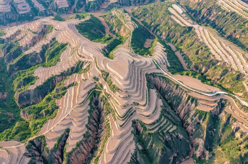 站在永和梯田觀景臺上,一壟壟地膜像一條條白色的絲帶,纏繞在層層疊疊的梯田間。連綿的山坡間、山塬上,鋪滿了綠色的盛裝——油松、連翹,還有地里的高粱苗,正孕育著無限的生機活力。