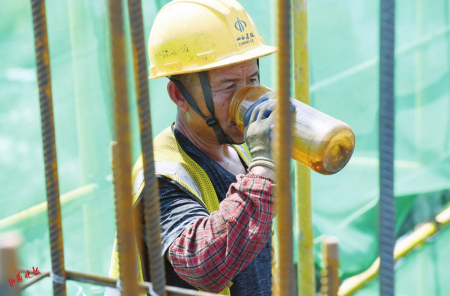 當日,是入伏第一天,意味著開始進入一年中最熱的時候。在熱火朝天的施工現(xiàn)場,工人師傅們埋頭苦干,他們雖然戴著自制遮陽帽、冰袖,身旁放著水壺,但一小會兒工夫就會汗流浹背?!斑@樣的杯子,我每天要喝好幾杯水。”天氣太熱,來自四川樂山的林英把杯子里的水一飲而盡。黝黑的皮膚、如雨的汗水、潮濕的后背……當大多數(shù)人避暑納涼時,不少勞動者卻辛勤地揮灑著汗水,堅守在施工一線。在這個工地上,有很多和林英一樣的打工人,他們來自全國各地,用青春和汗水建設(shè)美麗山西。