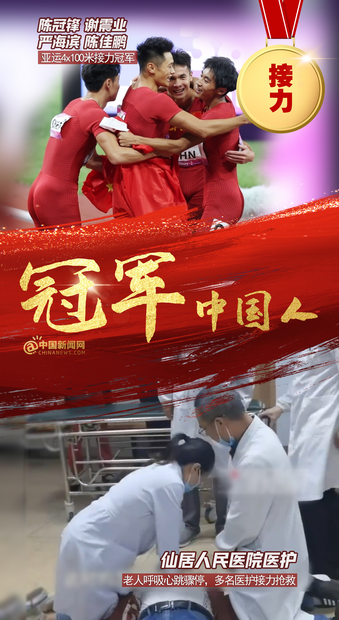 中新網(wǎng)12月15日電 全紅嬋、陳芋汐亞運(yùn)雙人10米臺(tái)奪金,彭清林跳十幾米大橋救人;中國(guó)男子4×100亞運(yùn)逆轉(zhuǎn)取勝,仙居人民醫(yī)院醫(yī)護(hù)接力搶救老人…賽場(chǎng)上,人生中,他們都是我們心中的冠軍!2023,冠軍屬于每個(gè)奮力拼搏獲得成績(jī),默默付出與人為善,激勵(lì)、幫助、照亮他人的中國(guó)人!