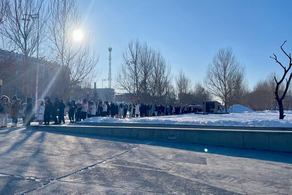 9日早上,哈爾濱氣溫低至零下20攝氏度,陳列館外早已排起長(zhǎng)隊(duì)。為了迎接高峰,陳列館延長(zhǎng)開(kāi)放時(shí)間,游客通過(guò)網(wǎng)上預(yù)約可免費(fèi)入館參觀,還有志愿者送上熱水或玉米糊幫他們驅(qū)寒。