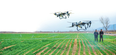 圖為在運(yùn)城市鹽湖區(qū)解州鎮(zhèn)曲村農(nóng)業(yè)科技示范基地,農(nóng)技人員操作植保無(wú)人機(jī)對(duì)麥田開(kāi)展春季除草作業(yè)。閆鑫攝