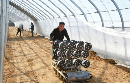 在定襄縣季莊鎮(zhèn)邱村的智能溫室大棚里,劉文治利用鋪種機(jī)將一根根種繩埋入土中。郭婧蕾攝