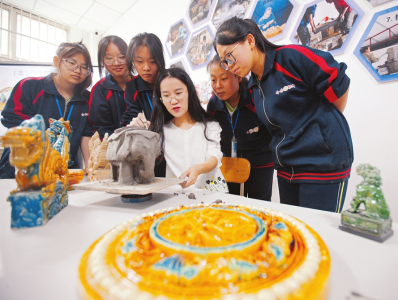 介休琉璃第五代傳承人劉文婷在介休市職業(yè)中學向學生示范琉璃制作工藝。