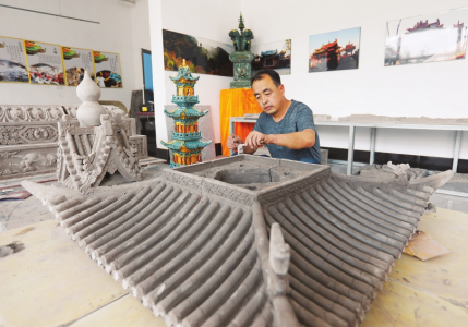 國家級非遺項目琉璃燒制技藝傳承人劉開寶將客戶訂制的琉璃制品“麒麟獻端”做最后的收尾工作。