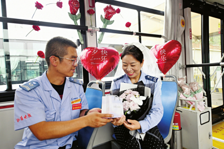 另一對公交夫妻是今年同為39歲的焦更新和李靈,均是812路公交車駕駛員,他們倆是初中同學(xué),當(dāng)天還是他們結(jié)婚第17年的紀(jì)念日。一大早,焦更新就來到車隊,布置車廂,等著妻子的到來。“老婆,結(jié)婚紀(jì)念日快樂!也祝你七夕快樂!”李靈看著鮮花和禮物很是驚訝,走到布置好的車廂后,更是紅了臉?!罢鏇]想到今年的結(jié)婚紀(jì)念日能收到這么大的驚喜,鮮花、浪漫的車廂,還有化妝品,很開心很感動,感謝老公的這份愛意。在工作中,我會把這份愛意傳遞給更多的乘客。”有著12年駕齡的李靈,是一名五星級駕駛員,她在提升駕駛技術(shù)和服務(wù)等方面很是鉆研,工作中還有自己的很多創(chuàng)新,在車廂布置“便民袋”,放上地圖、問候乘客的手繪海報等,細微的服務(wù)打動了很多乘客,她把車廂當(dāng)成自己的家一樣呵護。