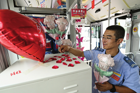 七夕節(jié)即將到來,8月8日,在太原公交第三汽車分公司,公交車廂里上演了一場別樣的浪漫——堅守在一線的兩名公交司機閻樹德和焦更新,分別為出車回來的妻子準(zhǔn)備了大大的驚喜。用送花、提前準(zhǔn)備飯菜、布置車廂等行動表達自己的愛意。