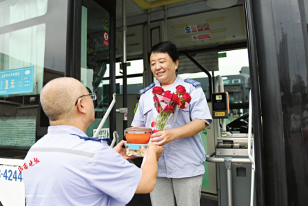 今年53歲的閻樹德和49歲的妻子王小娟,同為863路公交車駕駛員,他們夫妻走過了23年,這么多年相互理解、相互扶持,是同事眼中的模范夫妻。王小娟今年12月就要退休了,閻樹德給妻子準(zhǔn)備了餃子,炒了兩個菜,還買了鮮花。他希望這種簡單的方式,讓辛苦多年的妻子在退休前度過一個值得回憶的七夕節(jié)。王小娟看著老實本分的老公送給自己的禮物,開心地說:“我們相濡以沫這么多年,又搭檔駕駛同一輛公交車,早把這輛車當(dāng)成了第二個家?!狈蚱迋z這么多年默契配合,保持著零事故、零投訴的紀(jì)錄,他們相互照顧,用心用情服務(wù)著每一位乘客。