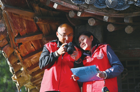 4月10日,張東星(左)、王燕燕在對(duì)山門木基層修繕痕跡拍照后進(jìn)行現(xiàn)場(chǎng)分析。