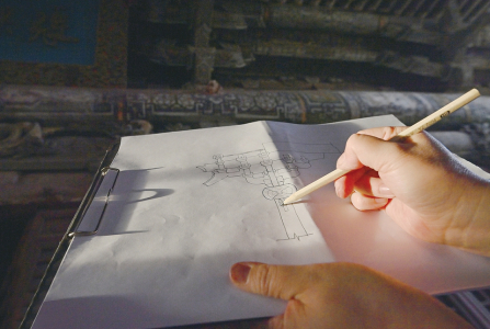 4月9日,趙利芳現(xiàn)場(chǎng)繪制正殿前檐柱頭鋪?zhàn)鳌?/span>