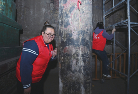 4月10日,張靜通過(guò)敲擊聽(tīng)音來(lái)檢測(cè)正殿后檐金柱有無(wú)中空現(xiàn)象。