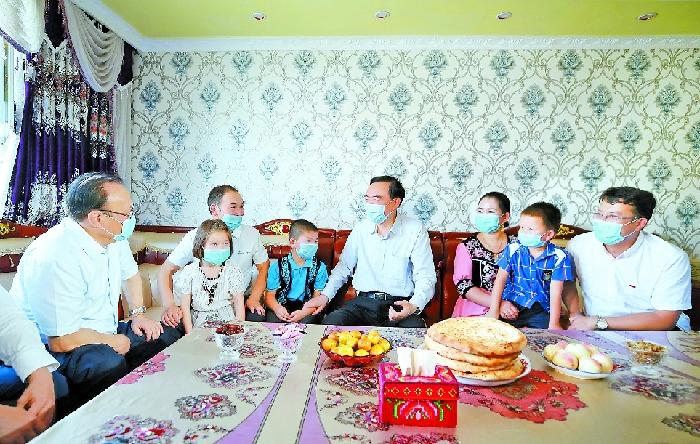 日前,自治區(qū)黨委書記陳全國,自治區(qū)黨委副書記、自治區(qū)主席雪克來提·扎克爾在克孜勒蘇柯爾克孜自治州調(diào)研統(tǒng)籌推進(jìn)常態(tài)化疫情防控和經(jīng)濟(jì)社會發(fā)展工作。這是陳全國、雪克來提·扎克爾在阿克陶縣絲路佳苑易地扶貧搬遷安置點(diǎn),走進(jìn)建檔立卡貧困戶穆拉提·艾海提家中,關(guān)心詢問搬遷后的生活情況,勉勵(lì)他們持續(xù)增收致富,把日子越過越好。 崔志堅(jiān)攝