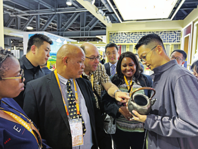 芮城布藝、平遙推光漆器、長(zhǎng)治八義窯紅綠彩瓷器、晉城晉藝坊鐵壺……一件件制作精美的非遺、文創(chuàng)展品引來(lái)眾多觀展者駐足欣賞。晉韻堂鐵壺作為晉城市的一張名片,代表山西省非遺參展。晉韻堂上海店負(fù)責(zé)人李艷偉這次帶來(lái)了熱銷(xiāo)款和新品。一款名為“四不猴”的鐵藝雕塑作品,將頭戴官帽的四只憨態(tài)可掬的鐵猴子雕刻得惟妙惟肖。看到幾位南非客商對(duì)晉韻堂鐵壺感興趣,晉韻堂鐵壺總部總經(jīng)理晉曉用流利的英語(yǔ)向他們熱情推介。