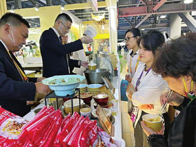 “此次參會(huì),山西會(huì)務(wù)集團(tuán)特別準(zhǔn)備了近年推陳出新、改良工藝的美食新品,希望以美食為載體,以文化為橋梁,讓更多人了解山西、走進(jìn)山西、愛(ài)上山西、投資山西?!蓖醮喝A說(shuō),“從連續(xù)幾天觀眾的反饋來(lái)看,山西刀削面、莜面栲栳栳最受大家歡迎,每天都有人排長(zhǎng)隊(duì)品嘗,可以說(shuō)供不應(yīng)求。此外,酥脆香甜的原平鍋盔、用石子炒制的石頭餅、精心烘焙的黃花餅、經(jīng)典小吃柳林碗托等都是觀眾愛(ài)吃的‘爆款’,再配合精彩的面食表演,來(lái)往客商連連點(diǎn)贊,直呼好吃好看。”
