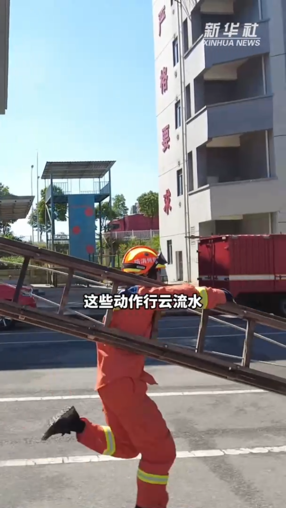 整理內(nèi)務(wù)、體能訓(xùn)練、專業(yè)訓(xùn)練都是日常要做的,穿著40多斤重的裝備,身手十分的嫻熟。拋擲水帶、連接分水器、架設(shè)消防梯、水槍連接水帶這些動作行云流水,絲毫不拖沓。