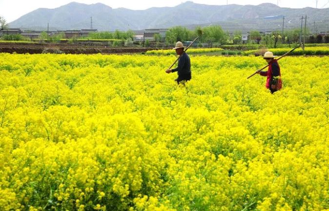 4月14日,在萬榮縣西村鄉(xiāng)望囑村的板藍(lán)根花地里游人在踏青賞花,親近自然。西村鄉(xiāng)到處都是板藍(lán)根花開放,競(jìng)相爭艷,連成一片花?!?/p>