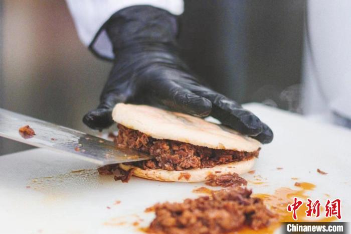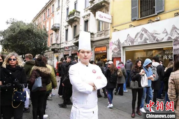 在意大利米蘭華人街,一家中國小吃店門前排著長隊(duì)。玻璃櫥窗后的操作間里,廚師撈出剛煮好的臘汁肉,切成肉燥,現(xiàn)烙的白吉饃從中切開,填入肉燥后再淋上肉汁,這饃酥肉香的肉夾饃,吸引食客們在路邊大快朵頤。