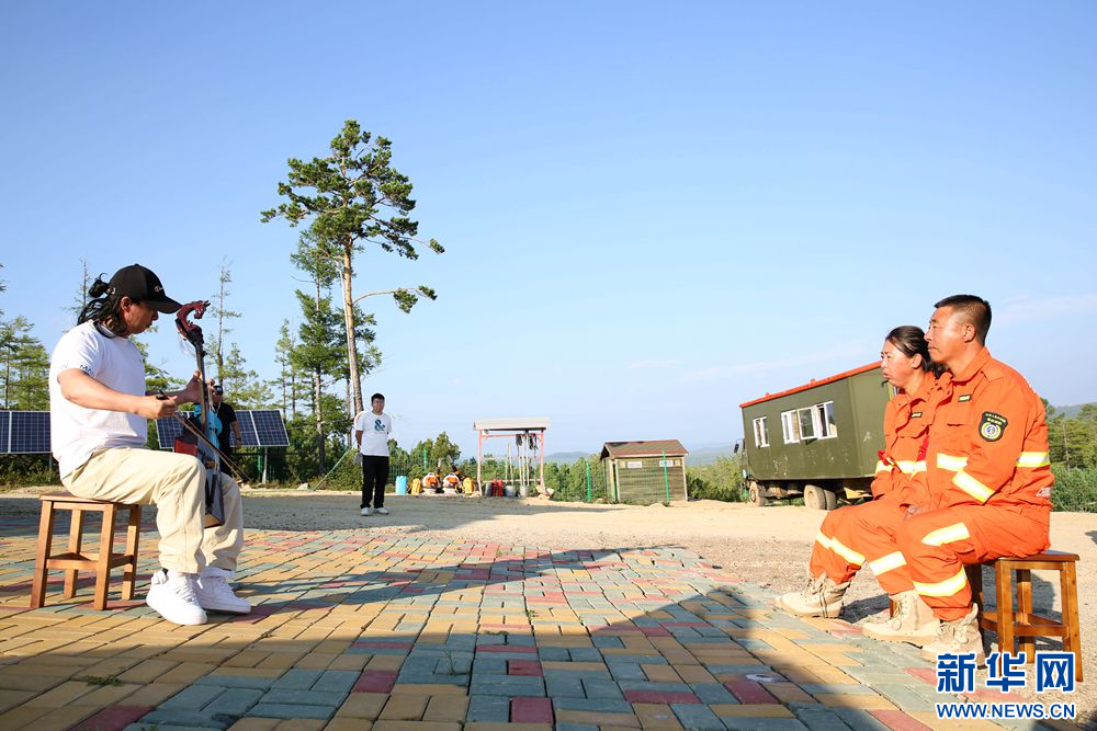 內(nèi)蒙古大興安嶺烏蘭牧騎隊(duì)員走上爬松嶺管護(hù)瞭望站,為孫華李穎夫婦獻(xiàn)上精彩演出(拍攝于8月12日)。新華網(wǎng)石毅 攝