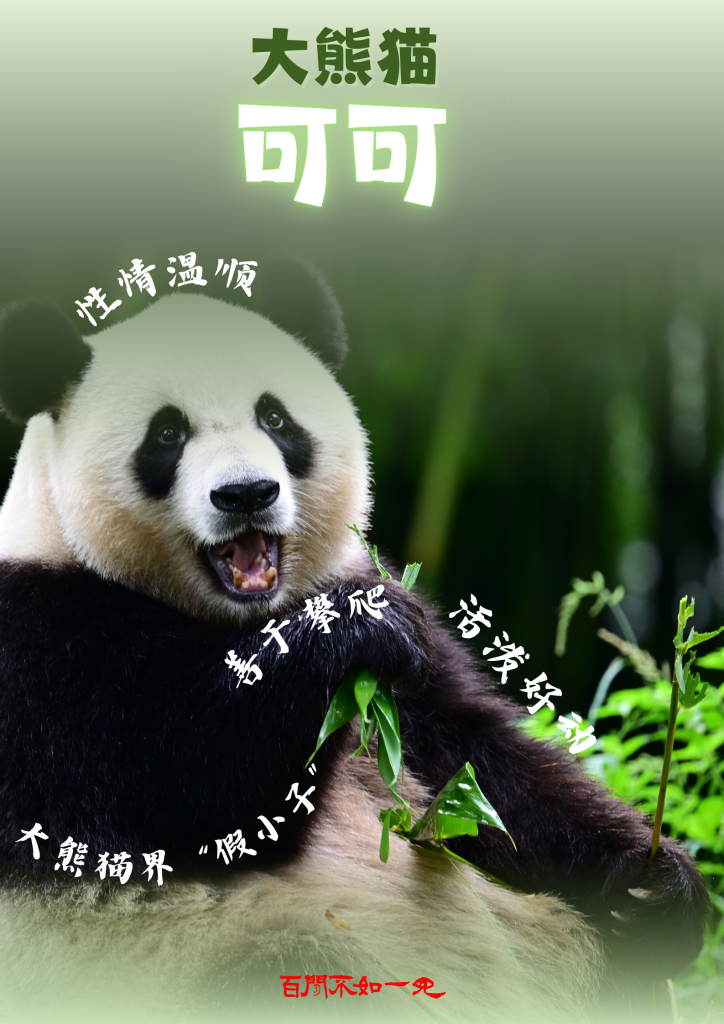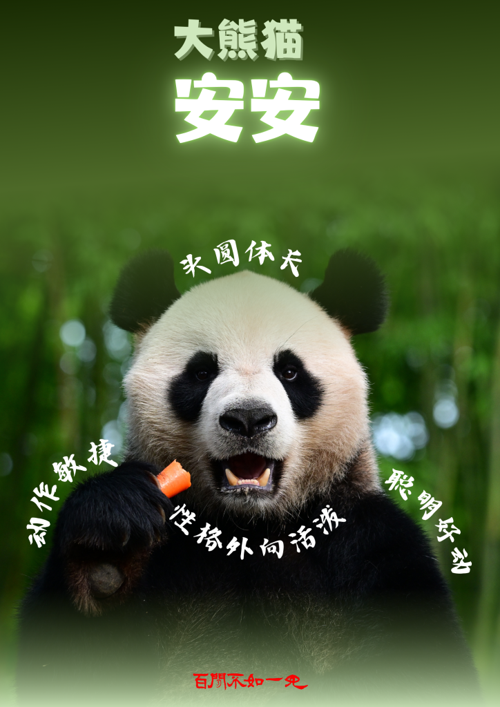 大熊貓“安安”,雄性,2019年6月出生,頭圓體長,動作敏捷,聰明好動,性格外向活潑。