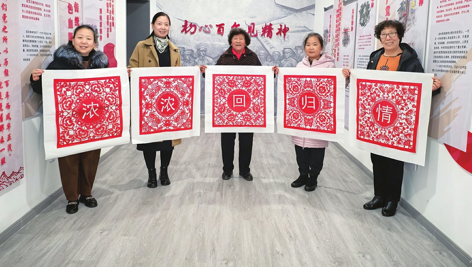 12月17日,陽泉市城區(qū)下站街道,陽泉市級非遺傳承人董淑芳(左二)與剪紙愛好者展示主題剪紙作品。當(dāng)日,下站街道舉辦“濃濃回歸情”主題剪紙活動,慶祝澳門回歸祖國25周年。所展示的剪紙作品圖案有的是澳門特別行政區(qū)區(qū)花蓮花,有的是象征團(tuán)結(jié)繁榮的牡丹花,還有象征福氣與好運(yùn)的福蝶和象征吉祥富貴的金魚。一幅幅精美的剪紙作品,表達(dá)了大家濃濃的愛國之情。