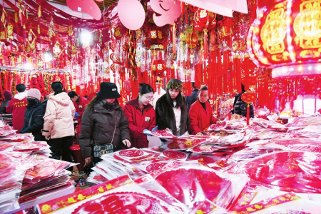 “今年蛇年,對聯(lián)和掛飾肯定以蛇元素為主,品類更加豐富,背膠和磁吸設(shè)計,掛貼更為方便?!痹谔炒筚u場,邢先生售賣春聯(lián)和窗花、燈籠等各類春節(jié)掛飾20多年了,一副副大紅的春聯(lián)掛滿了兩面墻壁,各類福字和掛飾鋪滿了整個攤位,顧客們正在選購自己喜歡的春聯(lián)和掛飾。他說,今年的春聯(lián)和春節(jié)掛飾有大幾百種,豐富多樣。臘八過后,來購買對聯(lián)和過年掛飾的人就開始多了起來,預(yù)計年前一周左右會達(dá)到高峰。