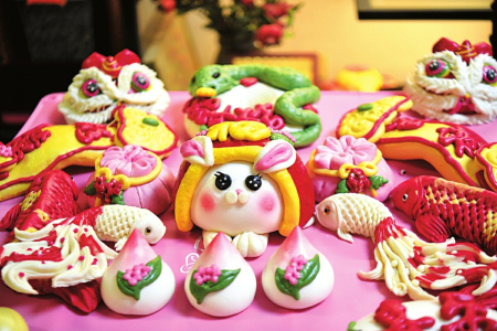 “生肖青蛇臥盤,雙春蛇年生機盎然;醒獅賀歲,歲歲平安;花開富貴葫蘆,福祿到家;可愛的醒獅兔,蛇盤兔代代富;平安扣青枝上盛開梅花,寓意花開富貴、孕育希望、生機盎然;可愛福袋,寓意代代有福、福氣滿滿;大紅錦鯉寓意好運連連……”馮秀說,今年的花饃圍繞“金蛇送?!边@一主題,設(shè)計了近20個品種,每款花饃都寓意吉祥和美好祝福。每一款非遺花饃的創(chuàng)意都是基于傳統(tǒng)文化,都是對傳統(tǒng)文化的致敬,也是人們對美好生活的期待和向往,“過年買花饃是吃在嘴里的年味兒,充滿了幸福感,我的花饃顧客來自全國各地,有的連續(xù)多年定制,成為了老朋友?!?/p>