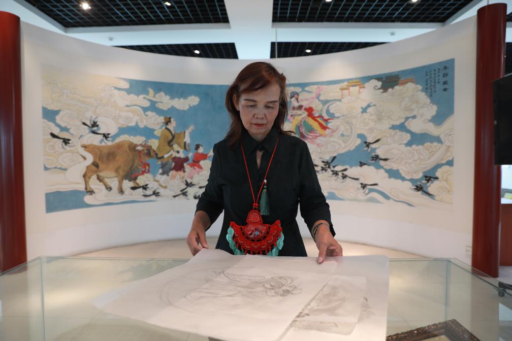 在和順,“刺繡”與“織女”亦有著巧妙的聯系。樸素的工作室內,省級非物質文化遺產和順刺繡代表性傳承人范素萍正以針線“編織”牛郎織女的故事。金絲銀線在她的指尖流轉,繡出鵲橋相會的動人畫面?!昂晚樑酉騺硪源汤C為榮,就像傳說中巧手的織女?!狈端仄夹χf道。