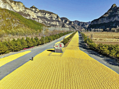 從空中俯瞰,景區(qū)標(biāo)志性的刻有“藏山”字樣的巨石,被連片的玉米“花?!杯h(huán)繞,綿延千米的道路上,玉米粒被村民們精心鋪成整齊的波紋狀,宛如一條流淌的金色長河。“今年景區(qū)把這么寬的路讓給我們晾曬糧食,真的解決了我們一大難題!”正在翻曬玉米的村民李師傅說道。
