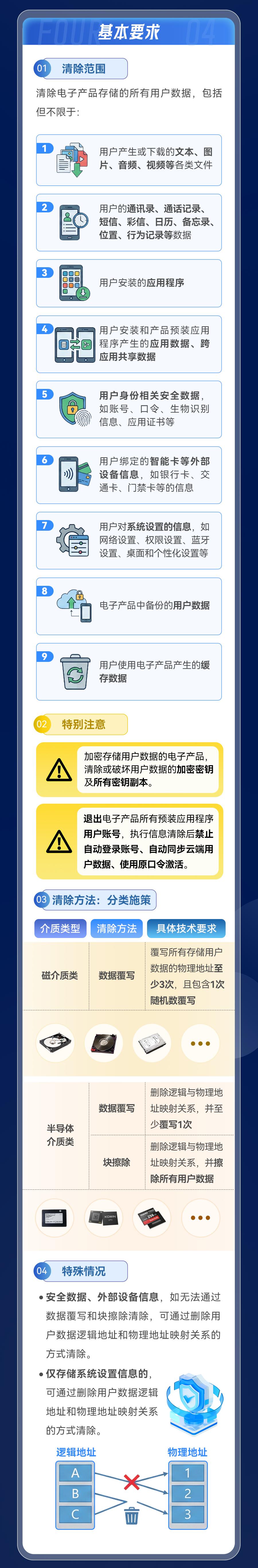 這項(xiàng)強(qiáng)制性國家標(biāo)準(zhǔn)的適用范圍涵蓋了在我國境內(nèi)生產(chǎn)、銷售的各類具有非易失性存儲(chǔ)介質(zhì)的電子產(chǎn)品,包括手機(jī)、平板電腦、筆記本電腦、臺(tái)式計(jì)算機(jī),以及智能穿戴設(shè)備、辦公設(shè)備等。其約束對象既包括電子產(chǎn)品制造商、技術(shù)服務(wù)提供方,也包括二手電子產(chǎn)品回收經(jīng)營者。