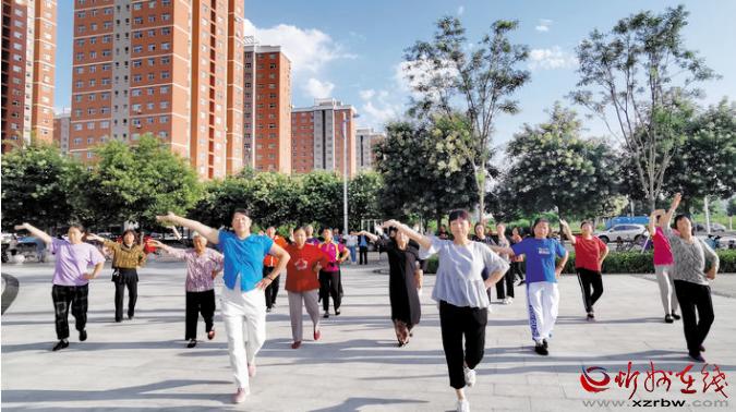 8月10日早上,民心家園小區(qū)居民在比鄰的遺山公園內(nèi)跳舞、走旗袍秀,展示精神風(fēng)貌,享受幸福生活。 曹建華 攝