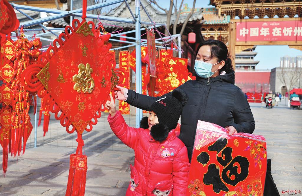 春節(jié)臨近,我市各大商場(chǎng)和年貨市場(chǎng)洋溢著濃濃的年味兒。春聯(lián)、“?!弊帧ⅰ爸袊?guó)結(jié)”等賀歲商品琳瑯滿目,到處都是紅紅火火的過(guò)年氣氛。右圖為2月3日,市民在忻州古城南北大街集市上選購(gòu)年貨。 (張存良 攝)