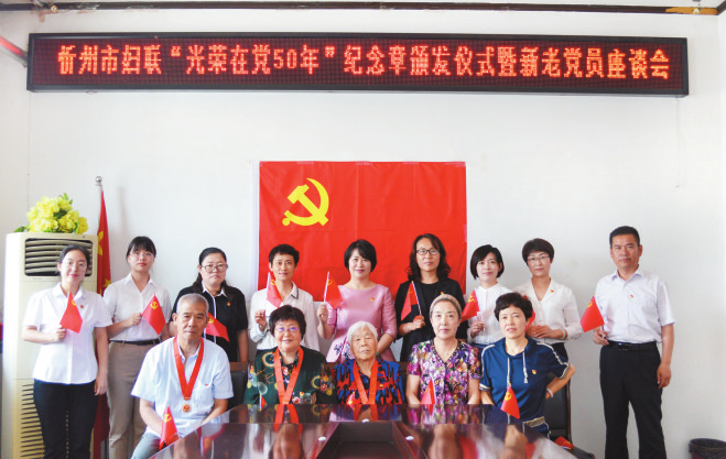 本報(bào)訊 6月25日上午,忻州市婦聯(lián)舉行“光榮在黨50年”紀(jì)念章頒發(fā)儀式暨新老黨員座談會。市婦聯(lián)機(jī)關(guān)在職黨員干部和老黨員代表參加。