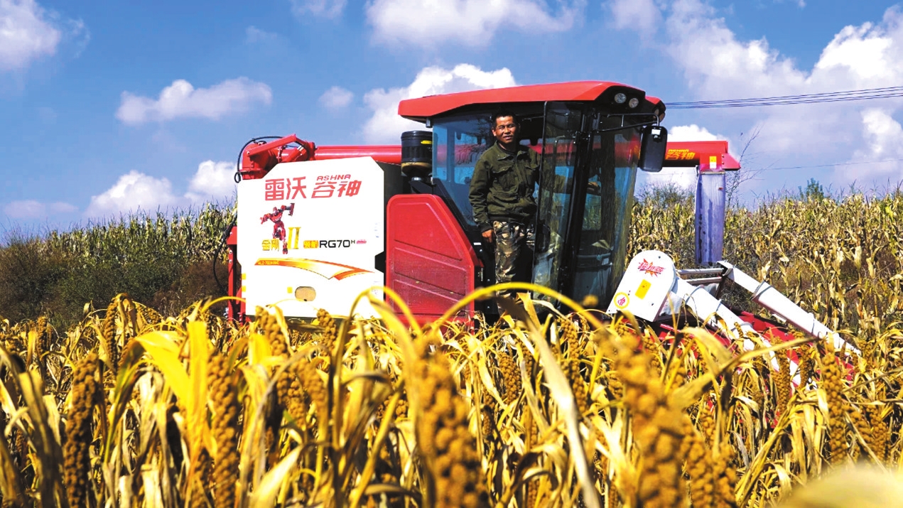 圖為偏關縣農(nóng)戶收割谷子的場景。