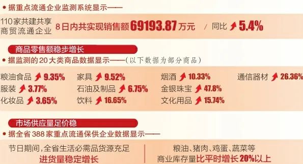商品零售額穩(wěn)步增長。各市結(jié)合消費者追求綠色健康、彰顯個性多樣、青睞科技智能等方面的消費新需求,通過發(fā)放政府電子消費券或指導(dǎo)商圈集聚營銷、品牌商品展銷、特色商品促銷等形式,持續(xù)拉動消費增長。據(jù)了解,全省各大商場節(jié)日禮盒、時令水果、糖果糕點、地方土特產(chǎn)、健康保健品、牛奶、飲料、煙酒等銷售旺盛。據(jù)監(jiān)測的20大類商品數(shù)據(jù)顯示,糧油食品、服裝、化妝品、家具、石油及制品同比分別增長9.35%、3.77%、3.65%、9.52%和6.75%;飲料、煙酒、金銀珠寶、文化用品、通信器材等實現(xiàn)了兩位數(shù)以上的增長,分別為16.65%、10.33%、47.8%、15.74%和26.36%。