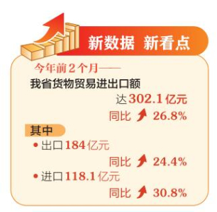 在去年同期低基數(shù)、重點企業(yè)延續(xù)增長態(tài)勢、多個重點商品大幅增長的疊加影響下,今年前2個月全省外貿(mào)實現(xiàn)大幅增長,新增長點不斷涌現(xiàn)。出口商品中,手機及零件、軌道交通裝備和煤炭是拉動出口增長的主要因素;進口商品中,集成電路、各類金屬礦砂、煤炭是拉動進口增長的主要因素。
